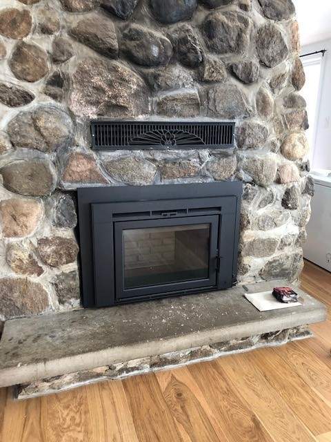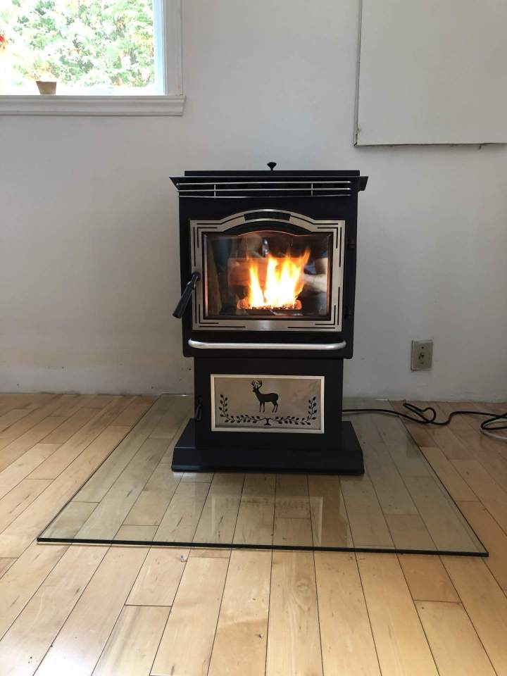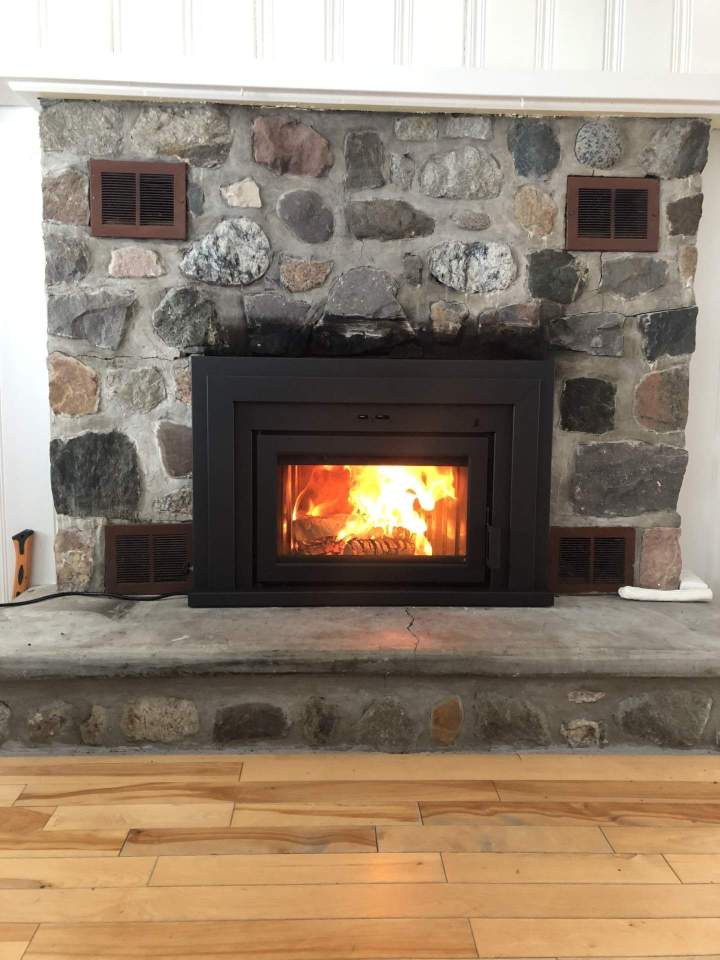 Les poêle aux granules permettent une installation plus épurée, la cheminée pouvant ne pas être apparente. Photos d'un poêle Harman XXV émaillé givré, installé par notre équipe.